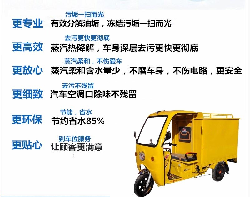 采用蒸汽高壓技術(shù)洗車,引進歐美先進技術(shù),擁有清水、泡沫、吸塵、風(fēng)干、鍍膜、除臭、凈手、玻璃水添加、防凍等齊全的功能,省水省電、節(jié)能環(huán)保、機型美觀、性能穩(wěn)定,節(jié)省費用,方便實用
